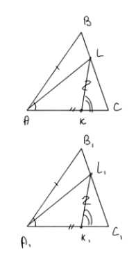 ΔABL ≅ ΔA₁B₁L₁ (по первому признаку: AB = A₁B₁, BL = B₁L₁, ∠B = ∠B₁).