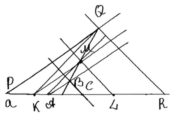 4. Соединяем точки P и P₁ прямой линией. Эта линия называется PP₁. Через точки, лежащие на отрезке MP₁, проводим прямые, которые параллельны линии PP₁. Эти прямые пересекают вторую сторону угла M в точках C’ и B’.